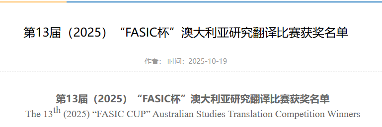 近日,第13届(2025)“FASIC杯”澳大利亚研究翻译大赛获奖名单正式公布。我校应用英语学院2025级翻译硕士英语笔译专业研究生黄智如、霍庆柱凭借扎实的语言功底与卓越的跨文化翻译能力,从北京大学、清华大学、北京外国语大学、华东师范大学、西安外国语大学等多所高校的参赛选手中脱颖而出,双双荣获优秀奖,展现了我校学子的专业素养与综合实力。